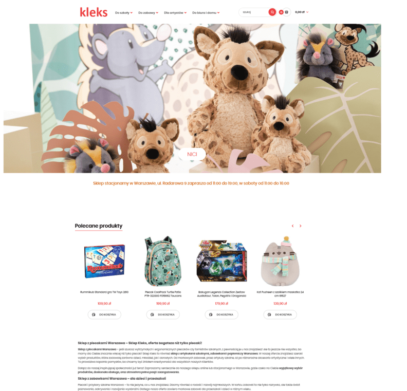 Sklep funkcjonuje również stacjonarnie, czyli rodzice z dziećmi mają możliwość do niego skierować się wtedy, kiedy tylko będą mieć na to chęć oraz oczekiwać, że będą obsługiwani na wyjątkowo wysokim pułapie. Kleks znany jest z tego, że w sklepie stacjonarnym działa bardzo miły punkt zabaw dla dzieci. Jest to miejsce przyjemne, które zachęca wręcz do następnych odwiedzin. Najważniejsze kategorie, w obrębie jakich można robić zakupy to: Do szkoły, Do zabawy, Dla artystów a także Dla biura i domu. W każdej z takich kategorii da się wyszukać bardzo dużo produktów. Przeznaczane są one na równi dla najmłodszych, młodzieży, jak i dla osób starszych. Od markowych zabawek, przez artykuły do szkoły, biurowe, bądź do wykonywania projektów plastycznych, można oczekiwać, że odnajdzie się produkty z certyfikacją, przetestowane a także takie, jakie będą w 100% rozwijały kreatwyne podejście. W punkcie sprzedaży specjalną kategorią są zabawki, które nie tylko służą zabawie, lecz także pomagają rozwijać wyobraźnię oraz nauczą tego co dzieje się wokół.